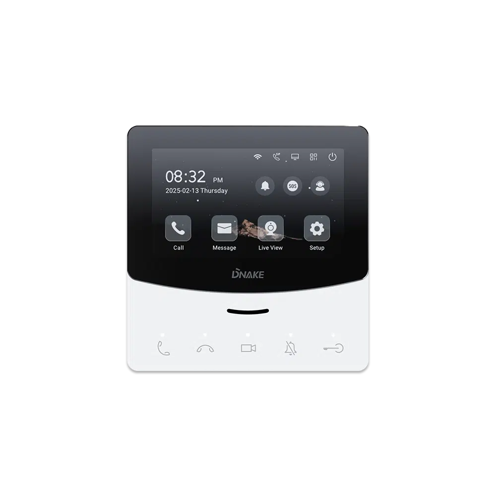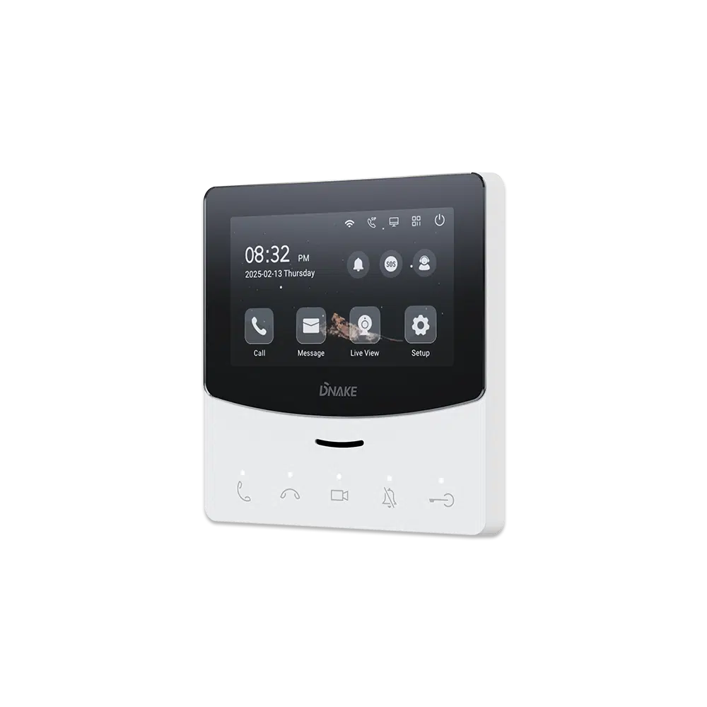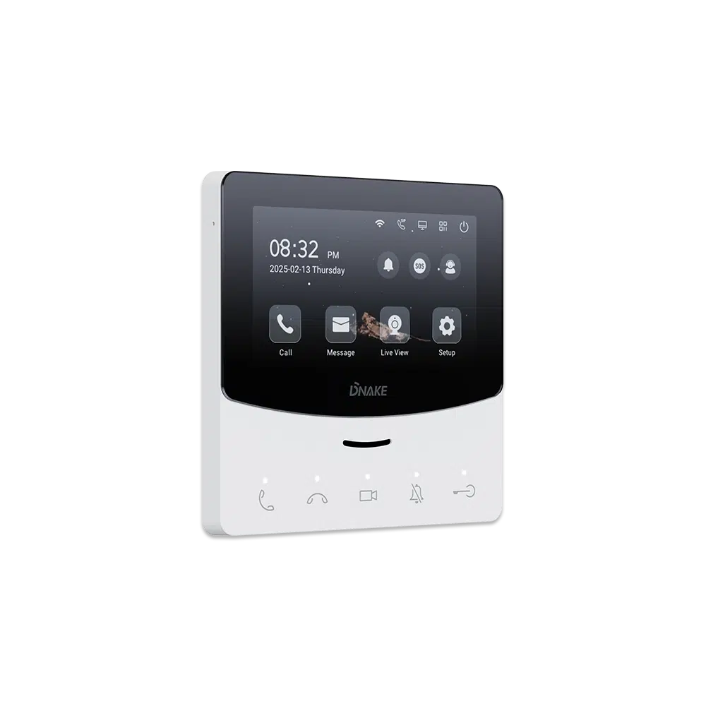 DNAKE E214 to kompaktowy 4,3-calowy monitor wewnętrzny IP z systemem Linux, zaprojektowany jako budżetowe rozwiązanie do systemów wideodomofonowych SIP/IP. Pięć przycisków dotykowych zapewnia intuicyjną obsługę, a niewielkie wymiary (123 × 121 mm) umożliwiają dyskretny montaż.