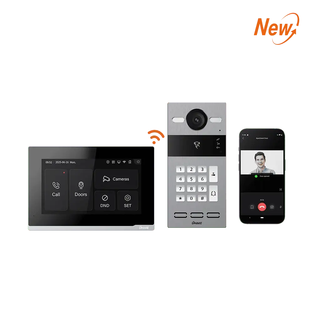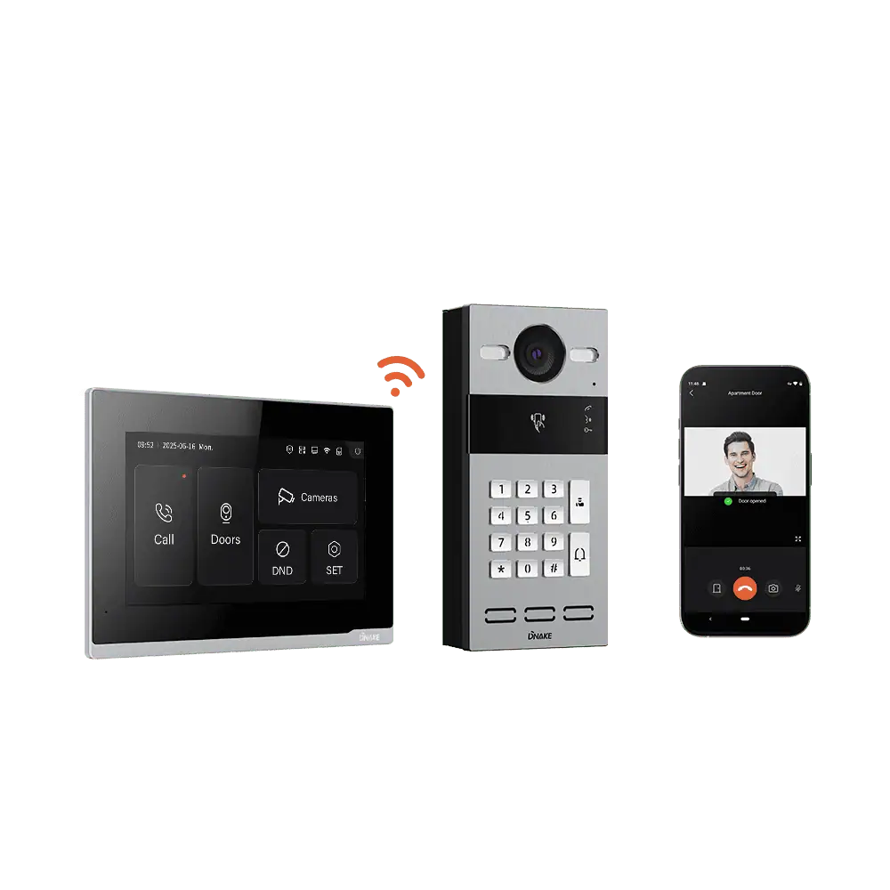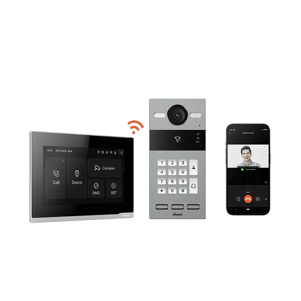 DNAKE IPK06W to wersja Wi-Fi zestawu IPK06, łącząca panel wejściowy S213K z klawiaturą numeryczną i monitor wewnętrzny E217W z 7-calowym ekranem Linux i Wi-Fi. Monitor z Wi-Fi nie wymaga kabla sieciowego – wystarczy zasilanie.
